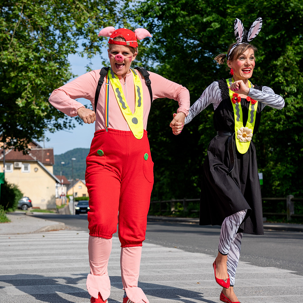 Vloga gledalcev: Naučijo se pravil obnašanja v prometu, pomenu zebrinih črt in pomagajo Jaki varno čez cesto.